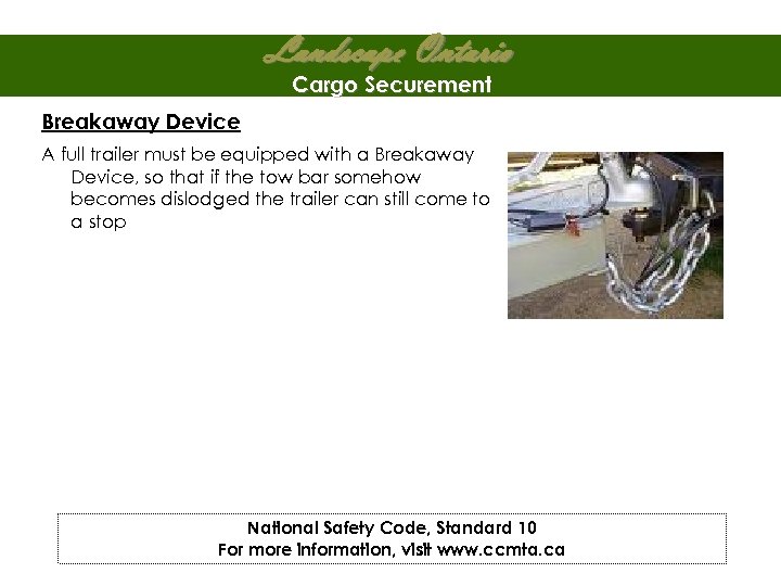 Landscape Ontario Cargo Securement Breakaway Device A full trailer must be equipped with a Breakaway Device, so that if the tow bar somehow becomes dislodged the trailer can still come to a stop National Safety Code, Standard 10 For more information, visit www. ccmta. ca