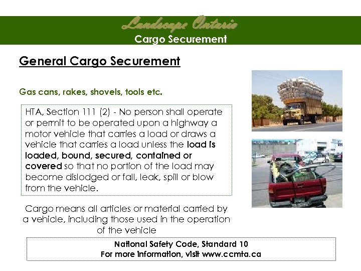 Landscape Ontario Cargo Securement General Cargo Securement Gas cans, rakes, shovels, tools etc. HTA, Section 111 (2) - No person shall operate or permit to be operated upon a highway a motor vehicle that carries a load or draws a vehicle that carries a load unless the load is loaded, bound, secured, contained or covered so that no portion of the load may become dislodged or fall, leak, spill or blow from the vehicle. Cargo means all articles or material carried by a vehicle, including those used in the operation of the vehicle National Safety Code, Standard 10 For more information, visit www. ccmta. ca