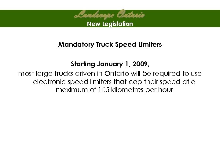 Landscape Ontario New Legislation Mandatory Truck Speed Limiters Starting January 1, 2009, most large trucks driven in Ontario will be required to use electronic speed limiters that cap their speed at a maximum of 105 kilometres per hour