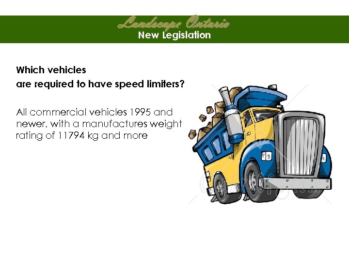Landscape Ontario New Legislation Which vehicles are required to have speed limiters? All commercial vehicles 1995 and newer, with a manufactures weight rating of 11794 kg and more