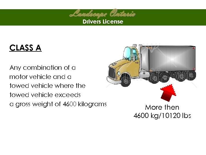 Landscape Ontario Drivers License CLASS A Any combination of a motor vehicle and a towed vehicle where the towed vehicle exceeds a gross weight of 4600 kilograms More then 4600 kg/10120 lbs