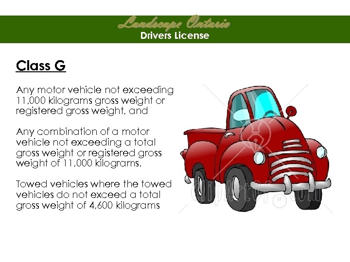 Landscape Ontario Drivers License Class G Any motor vehicle not exceeding 11, 000 kilograms gross weight or registered gross weight, and Any combination of a motor vehicle not exceeding a total gross weight or registered gross weight of 11, 000 kilograms. Towed vehicles where the towed vehicles do not exceed a total gross weight of 4, 600 kilograms