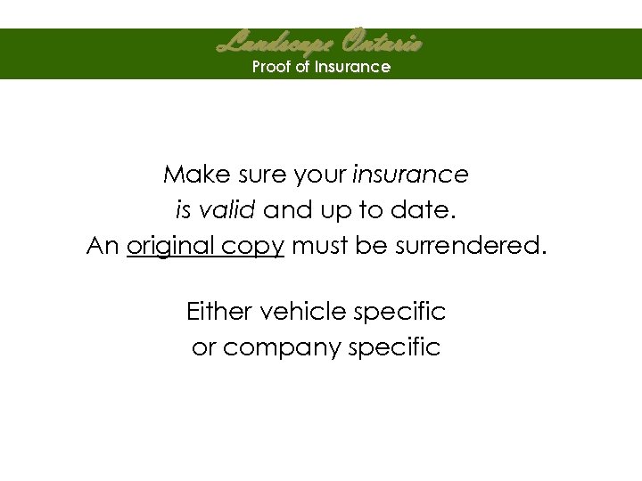 Landscape Ontario Proof of Insurance Make sure your insurance is valid and up to date. An original copy must be surrendered. Either vehicle specific or company specific