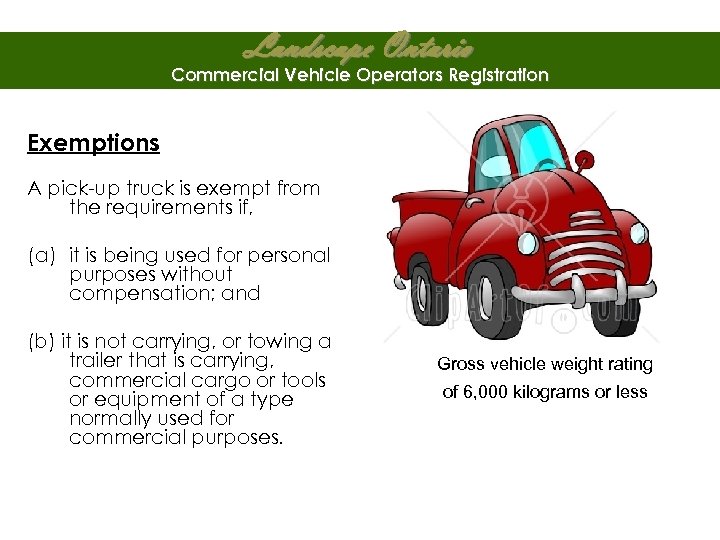 Landscape Ontario Commercial Vehicle Operators Registration Exemptions A pick-up truck is exempt from the requirements if, (a) it is being used for personal purposes without compensation; and (b) it is not carrying, or towing a trailer that is carrying, commercial cargo or tools or equipment of a type normally used for commercial purposes. Gross vehicle weight rating of 6, 000 kilograms or less