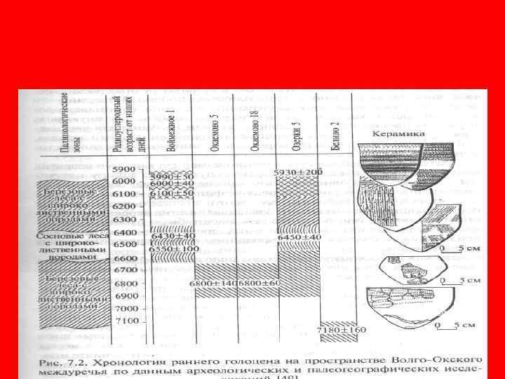 Расположение культурных слоев различных исторических эпох в ландшафтах речных долин центра России • • • 1 – слои культур раннего неолита; 2 – слои культур среднего неолита (льяловская культура); 3 – слои культур позднего неолита (фатьяновская культура; 4 – слои культур дюнных стоянок; 5 – слои финно-угорской культуры; 6 – слои славянской культуры.