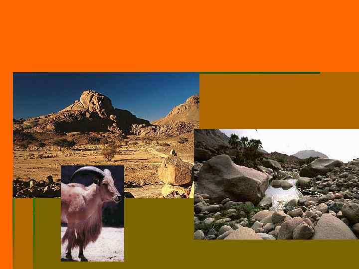 Основные черты растительности Сахары § Северная подзона – злаково-кустарниковая растительность (аристида и некоторые средиземноморские виды) § Центральная подзона – собственно пустыни (акации, тамариксы, пальма дум) § Южная подзона – злаково-кустарниковый покров § Песчаные пустыни – дрин, джузгун, ретам, эфедра