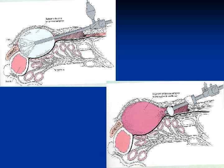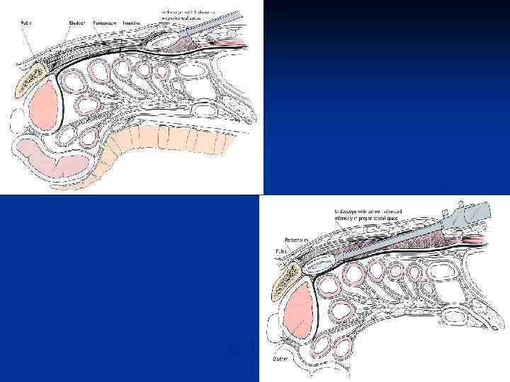 Лапароскопічна пахвинна герніопластика n IPOM (Intra. Peritoneal On-lay Mesh) Сітка розміщується інтраабдомінально, закриваючи дефект під очеревиною. Контакт сітки з кишечником вимагає застосування спеціальних двохшарових сіток з фіксацією герніостеплером. n TAPP (Trans Abdominal Pre-Peritoneal) repair. Передочеревинний простір розкривається з боку черевної порожнини. Сітка фіксується герніостеплером та накривається очеревиною. Спосіб дозволяє вправити вміст грижового мішка і оцінити його стан. n TEP (Totally Extra. Peritoneal) repair. Сітка відразу розміщується у передочеревинному просторі, але цей доступ не дозволяє провести ревізію черевної порожнини. Спосіб найменш травматичний, не вимагає обовязкової фіксації сітки. Виконується стандартними інструментами.