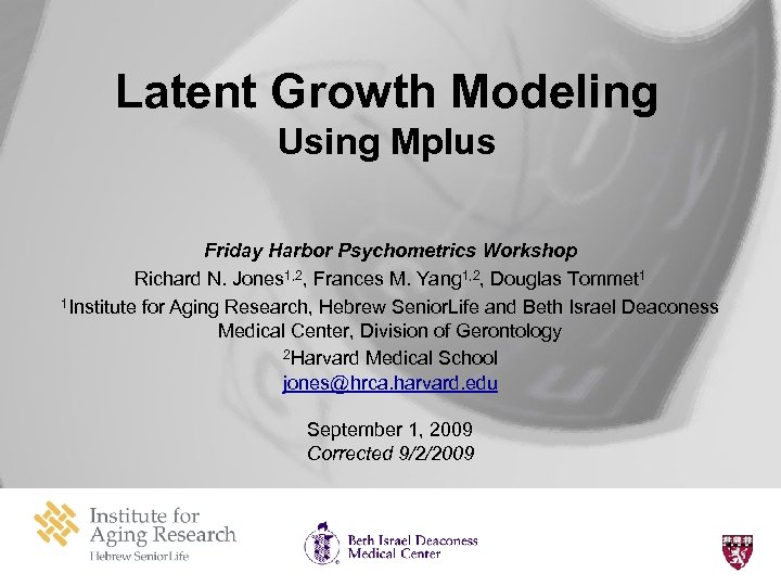 Latent Growth Modeling Using Mplus Friday Harbor Psychometrics Workshop Richard N. Jones 1, 2, Frances M. Yang 1, 2, Douglas Tommet 1 1 Institute for Aging Research, Hebrew Senior. Life and Beth Israel Deaconess Medical Center, Division of Gerontology 2 Harvard Medical School jones@hrca. harvard. edu September 1, 2009 Corrected 9/2/2009 1