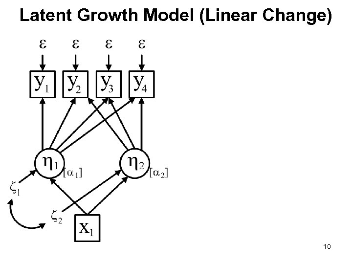 Latent Growth Curve Models • Latent Growth Curve (LGC) modeling is just like CFA • Reconceptualize “factors” as “random effects” • Factor loadings are – (usually) not estimated but given by design or data, and – relate to the sequence of repeated observations • The action is in the mean structure part of the model (factor means, item means, factor variances) as opposed to factor loadings 9