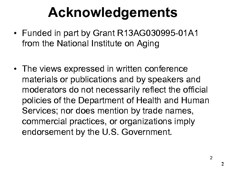 Acknowledgements • Funded in part by Grant R 13 AG 030995 -01 A 1 from the National Institute on Aging • The views expressed in written conference materials or publications and by speakers and moderators do not necessarily reflect the official policies of the Department of Health and Human Services; nor does mention by trade names, commercial practices, or organizations imply endorsement by the U. S. Government. 2 2