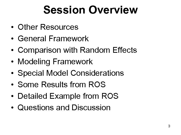 Session Overview • • Other Resources General Framework Comparison with Random Effects Modeling Framework Special Model Considerations Some Results from ROS Detailed Example from ROS Questions and Discussion 3