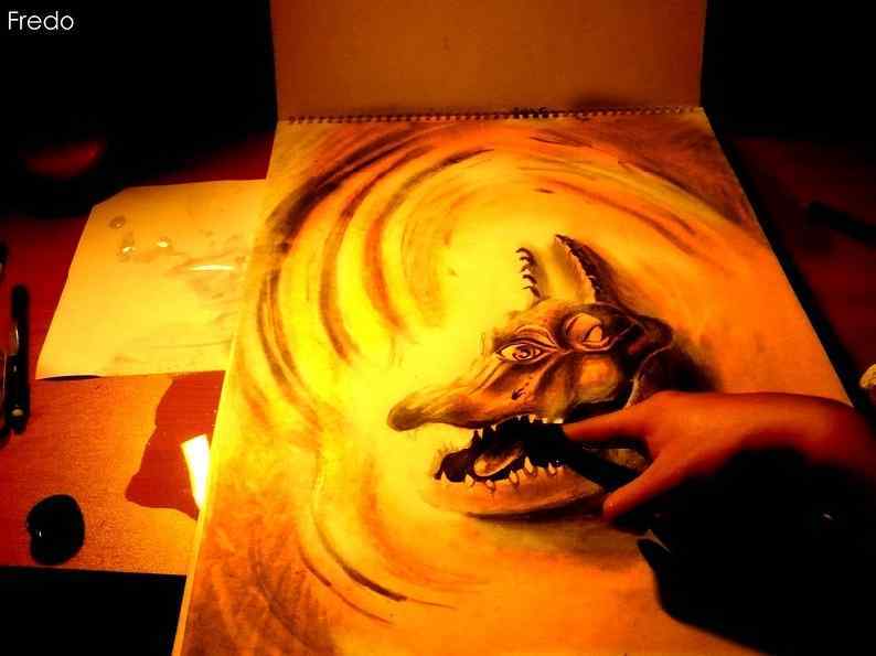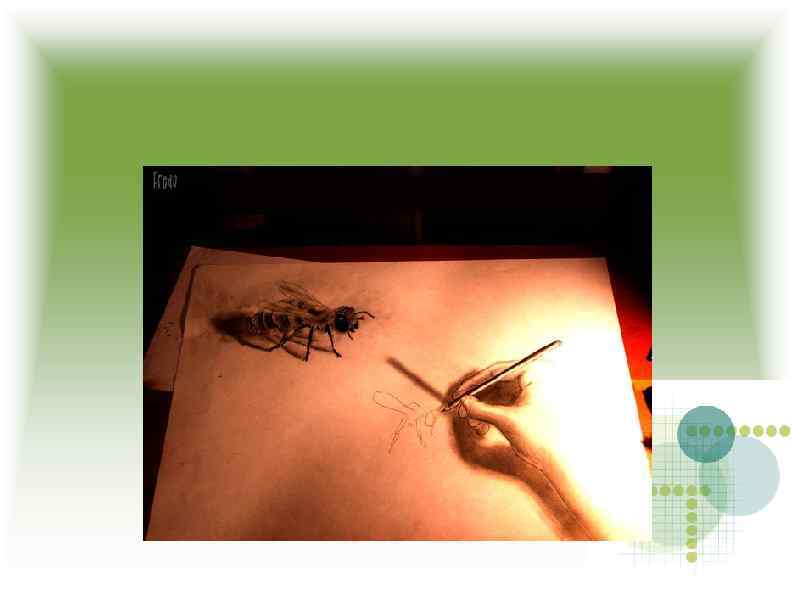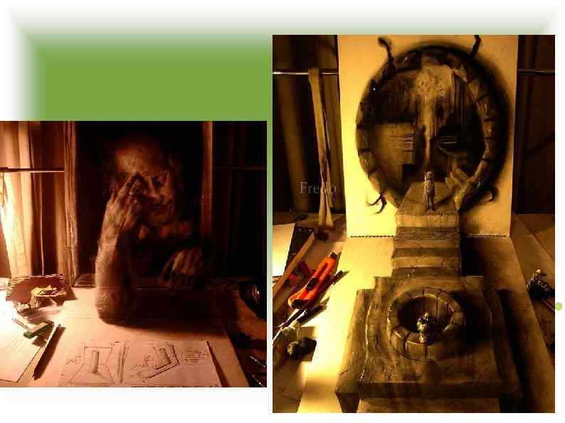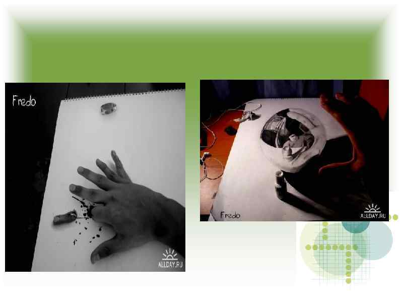 Фредо (настоящее имя Wladimir Inostroza) Художник рисовал бабочку лежа на диване, склонив голову на бок. Когда работа была закончена Фредо понял, что картинка получилась слишком вытянутой, но стоило немного наклонить лист и дорисовать тень, бабочка начинала казаться реалистично объемной. Таким образом он открыл для себя технику, которую уже давно используют художники объемного граффити. Юный чилийский художник рисует совершенно умопомрачительные трехмерные рисунки карандашом, которые выглядят так, как-будто они вот-вот спрыгнут со страниц.