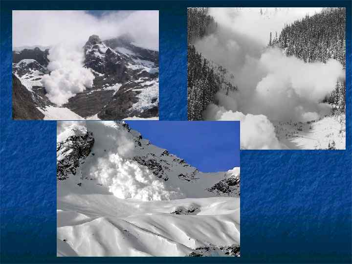 Лавина – быстрое, внезапно возникающее движение снега и (или) льда вниз по крутым склонам гор, представляющее угрозу жизни и деятельности людей. Возникают в горах. Сход лавины сопровождается образованием воздушной предударной волны, производящей наибольшие разрушения.