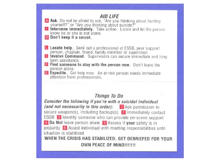 Intervention “Don’t List” ü ü ü Don’t sound shocked Don’t deny/minimize threat Don’t offer empty promises Don’t debate morality Don’t leave the person alone Don’t be the only person helping