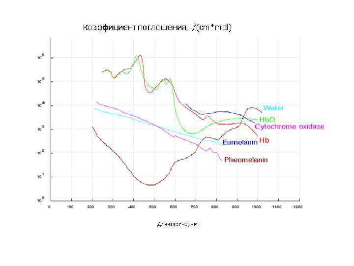 Поглощение света является одной из характеристик эффективности взаимодействия света с исследуемым биологическим объектом. Спектры поглощения биообъектов определяются типом доминирующих поглощающих центров, так называемых хромофоров, и содержащейся в них водой. Рис. Зависимость доли световой энергии ∆Е/Е, поглощенной кровенаполненной биотканью толщиной 1 мм, от длины волны λ.