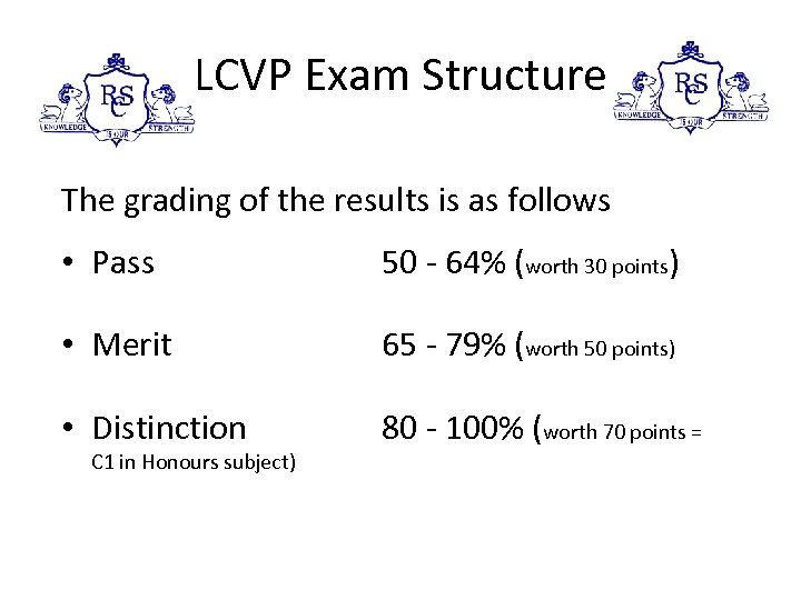 LCVP Exam Structure The grading of the results is as follows • Pass 50 - 64% (worth 30 points) • Merit 65 - 79% (worth 50 points) • Distinction 80 - 100% (worth 70 points = C 1 in Honours subject)