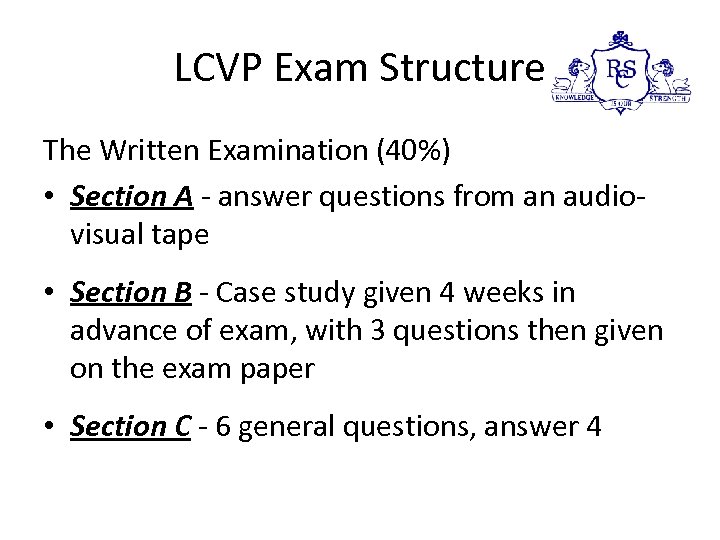 LCVP Exam Structure The Written Examination (40%) • Section A - answer questions from an audiovisual tape • Section B - Case study given 4 weeks in advance of exam, with 3 questions then given on the exam paper • Section C - 6 general questions, answer 4