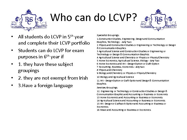 Who can do LCVP? • All students do LCVP in 5 th year and complete their LCVP portfolio • Students can do LCVP for exam purposes in 6 th year if • 1. they have these subject groupings • 2. they are not exempt from Irish • 3. Have a foreign language Specialist Groupings: 1. Construction Studies; Engineering; Design and Communication Graphics; Technology - Any Two 2 Physics and Construction Studies or Engineering or Technology or Design & Communication Graphics 3 Agricultural Science and Construction Studies or Engineering or Technology or Design & Communication Graphics 4 Agricultural Science and Chemistry or Physics/Chemistry 5 Home Economics; Agricultural Science; Biology - Any Two 6 Home Economics and Art - Design Option or Craft Option 7 Accounting; Business; Economics - Any two 8 Physics and Chemistry 9 Biology and Chemistry or Physics/Chemistry 10 Biology and Agricultural Science 11 Art - Design Option or Craft Option and Design & Communication Graphics Services Groupings 12. Engineering or Technology or Construction Studies or Design & Communication Graphics and Accounting or Business or Economics 13 Home Economics and Accounting or Business or Economics 14 Agricultural Science and Accounting or Business or Economics 15 Art Design or Craftwork Option and Accounting or Business or Economics 16 Music and Accounting or Business or Economics