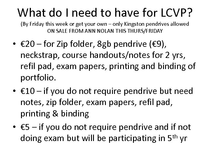 What do I need to have for LCVP? (By Friday this week or get your own – only Kingston pendrives allowed ON SALE FROM ANN NOLAN THIS THURS/FRIDAY • € 20 – for Zip folder, 8 gb pendrive (€ 9), neckstrap, course handouts/notes for 2 yrs, refil pad, exam papers, printing and binding of portfolio. • € 10 – if you do not require pendrive but need notes, zip folder, exam papers, refil pad, printing & binding • € 5 – if you do not require pendrive and if not doing exam but will be participating in 5 th yr