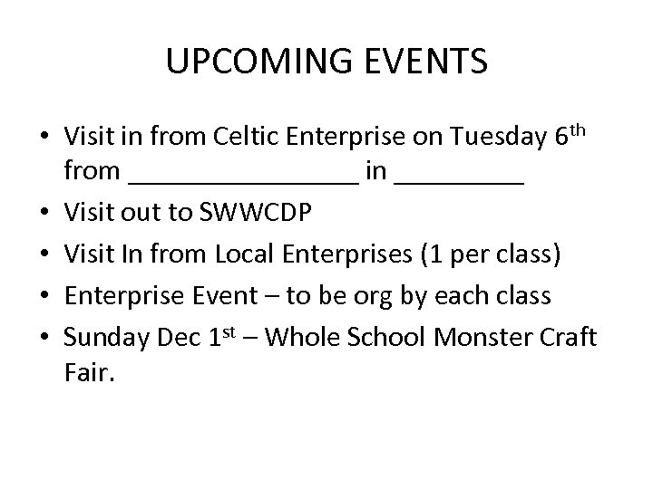 UPCOMING EVENTS • Visit in from Celtic Enterprise on Tuesday 6 th from ________ in _____ • Visit out to SWWCDP • Visit In from Local Enterprises (1 per class) • Enterprise Event – to be org by each class • Sunday Dec 1 st – Whole School Monster Craft Fair.