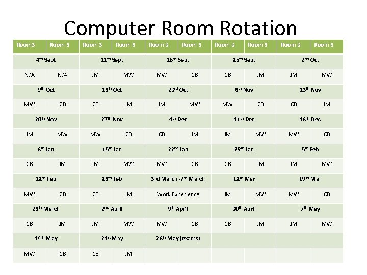 Computer Room Rotation Room 3 Room 6 Room 3 4 th Sept N/A JM 9 th Oct CB MW CB 20 th Nov MW JM MW 8 th Jan CB JM 12 th Feb MW 26 th March CB MW CB JM 21 st May CB CB MW MW CB CB CB 5 th Feb JM JM 12 th Mar JM JM MW MW 19 th Mar MW MW 30 th April 28 th May (exams) JM CB 18 th Dec CB 9 th April MW CB JM MW 13 th Nov 29 th Jan Work Experience 2 nd April 14 th May CB MW JM 11 th Dec JM Room 6 2 nd Oct JM MW 3 rd March -7 th March JM JM MW CB Room 3 6 th Nov 22 nd Jan 26 th Feb CB CB 4 th Dec CB Room 6 25 th Sept CB JM 15 th Jan JM Room 3 23 rd Oct 27 th Nov MW Room 6 18 th Sept 16 th Oct MW MW Room 3 11 th Sept N/A JM Room 6 CB 7 th May JM JM MW