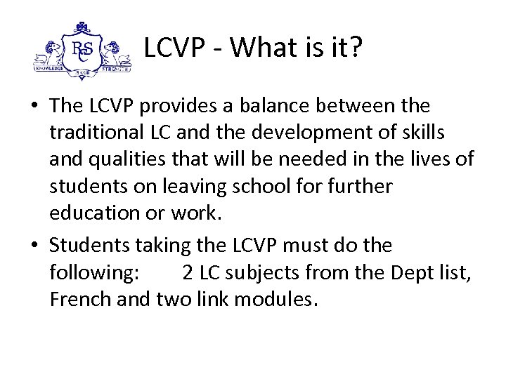LCVP - What is it? • The LCVP provides a balance between the traditional LC and the development of skills and qualities that will be needed in the lives of students on leaving school for further education or work. • Students taking the LCVP must do the following: 2 LC subjects from the Dept list, French and two link modules.
