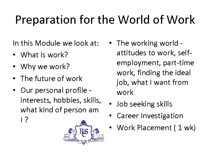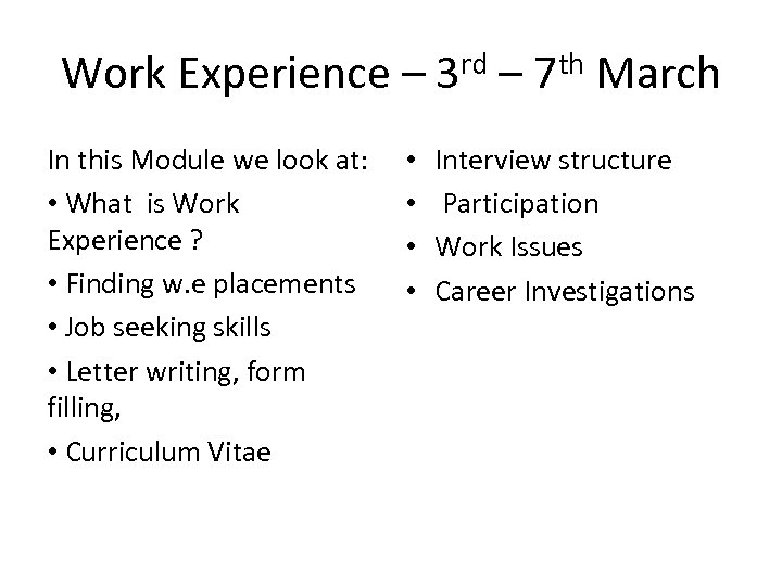 Work Experience – 3 rd – 7 th March In this Module we look at: • What is Work Experience ? • Finding w. e placements • Job seeking skills • Letter writing, form filling, • Curriculum Vitae • • Interview structure Participation Work Issues Career Investigations