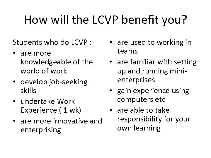 How will the LCVP benefit you? Students who do LCVP : • are more knowledgeable of the world of work • develop job-seeking skills • undertake Work Experience ( 1 wk) • are more innovative and enterprising • are used to working in teams • are familiar with setting up and running minienterprises • gain experience using computers etc • are able to take responsibility for your own learning