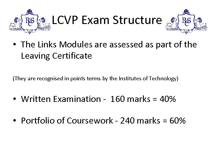 LCVP Exam Structure • The Links Modules are assessed as part of the Leaving Certificate (They are recognised in points terms by the Institutes of Technology) • Written Examination - 160 marks = 40% • Portfolio of Coursework - 240 marks = 60%