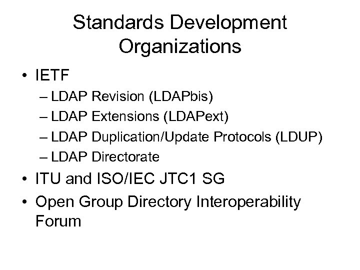 Standards Development Organizations • IETF – LDAP Revision (LDAPbis) – LDAP Extensions (LDAPext) – LDAP Duplication/Update Protocols (LDUP) – LDAP Directorate • ITU and ISO/IEC JTC 1 SG • Open Group Directory Interoperability Forum