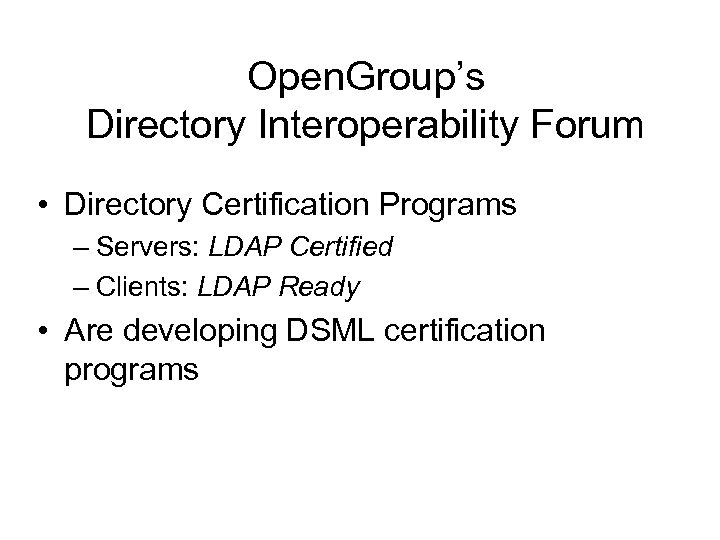 Open. Group’s Directory Interoperability Forum • Directory Certification Programs – Servers: LDAP Certified – Clients: LDAP Ready • Are developing DSML certification programs