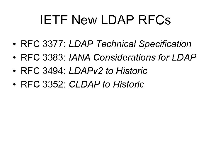 IETF New LDAP RFCs • • RFC 3377: LDAP Technical Specification RFC 3383: IANA Considerations for LDAP RFC 3494: LDAPv 2 to Historic RFC 3352: CLDAP to Historic