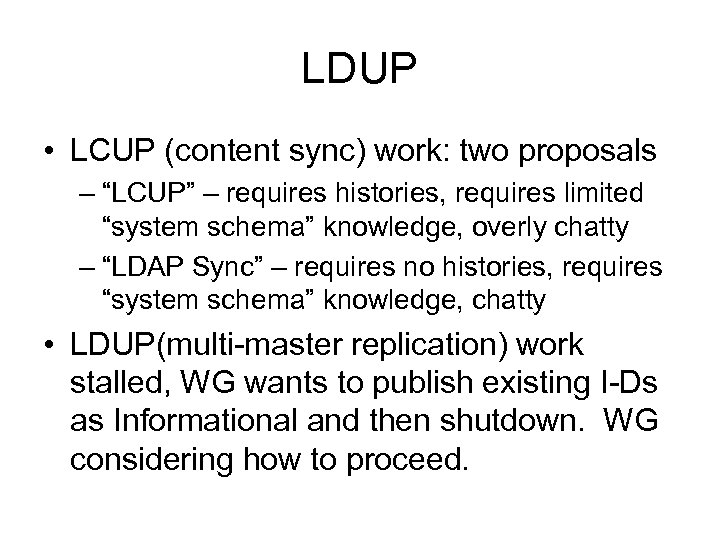 LDUP • LCUP (content sync) work: two proposals – “LCUP” – requires histories, requires limited “system schema” knowledge, overly chatty – “LDAP Sync” – requires no histories, requires “system schema” knowledge, chatty • LDUP(multi-master replication) work stalled, WG wants to publish existing I-Ds as Informational and then shutdown. WG considering how to proceed.