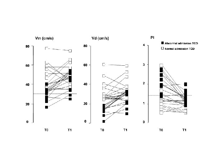 Avec le DTC 24 traumatismes crâniens sévères (GCS 8) Protocole : T 0 = admission => DTC à l'arrivée Si 2 critères : Vm < 30 cm/s, Vd < 20 cm/s, IP > 1. 4 DTC anormal => Augmenter la perfusion cérébrale T 1 = PIC et Svj. O 2 => DTC de contrôle