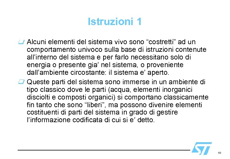 Istruzioni 1 Alcuni elementi del sistema vivo sono “costretti” ad un comportamento univoco sulla base di istruzioni contenute all’interno del sistema e per farlo necessitano solo di energia o presente gia’ nel sistema, o proveniente dall’ambiente circostante: il sistema e’ aperto. Queste parti del sistema sono immerse in un ambiente di tipo classico dove le parti (acqua, elementi inorganici disciolti e composti organici) si comportano classicamente fin tanto che sono “liberi”, ma possono divenire elementi costituenti di parti del sistema in grado di gestire l’informazione codificata di cui si e’ detto. 10