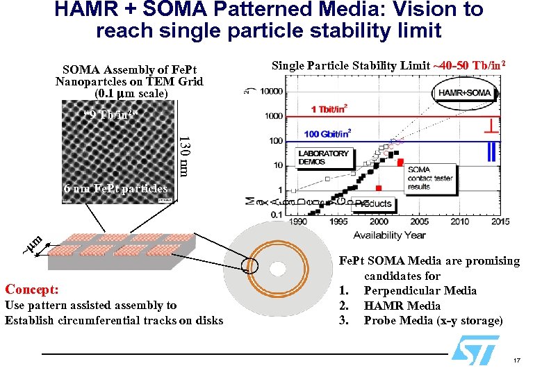 Outlook: Circumferential SOMA Tracks Idea: Lithographically of chemically assisted Dual Patterning Topographic Chemical SOMA Disk ~10 -50 mm long SOMA packets with “perfect ordering” needed for data block of ~5000 bits used in TURBO codes See recent literature: K. Naito, et al. "2. 5 inch Disk Patterned Media Prepared by an Artificially Assisted Self-Assembling Method" IEEE Trans on Mag. , 38, 1949 (2002); J. Y. Cheng, et al. , "Magnetic properties of Large-Area Particle Arrays Fabricated Using Block Copolymer Lithography", IEEE Trans. , 38, 2541 (2002). 16