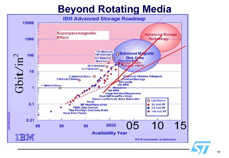 Bit Patterned Media Lithography vs Self Organization Lithographically Defined Fe. Pt SOMA media Major obstacle is finding low cost means of making media. n n At 1 Tbpsi, assuming a square bit cell and equal lines and spaces, 12. 5 nm lithography would be required. Semiconductor Industry Association roadmap does not project such linewidths within the next decade. 6. 3+/-0. 3 nm Fe. Pt particles S. Sun, Ch. Murray, D. Weller, L. Folks, A. Moser, Science 287, 1989 (2000). SOMA, combined with HAMR for writing is projected to support densities of 40 -50 Tbpsi. STUniversity, 18 april 2005 – Conference on Nanoelectronics and Nanotechnologies – U. Mastromatteo 18