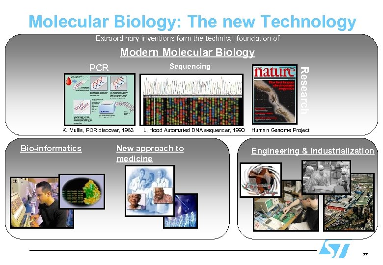 Molecular Biology: The new Technology Extraordinary inventions form the technical foundation of Modern Molecular Biology K. Mullis, PCR discover, 1983 Bio-informatics L. Hood Automated DNA sequencer, 1990 New approach to medicine Research Sequencing PCR Human Genome Project Engineering & Industrialization 37