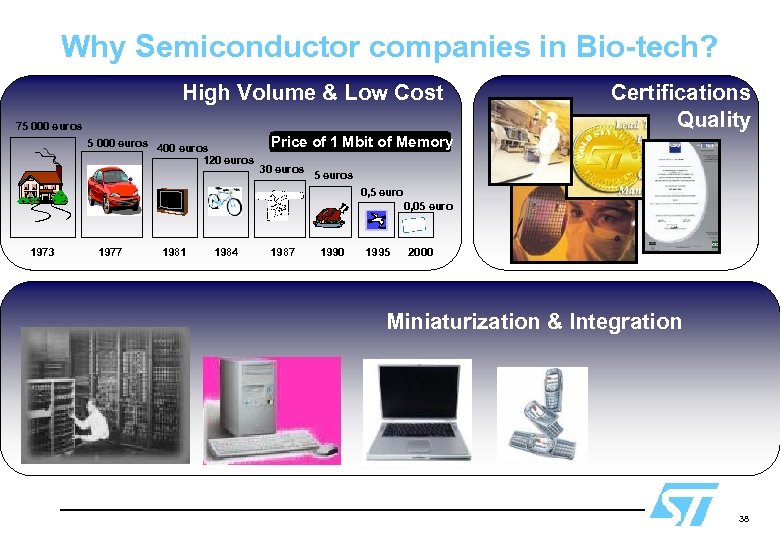 Why Semiconductor companies in Bio-tech? High Volume & Low Cost 75 000 euros 400 euros 120 euros Certifications Quality Price of 1 Mbit of Memory 30 euros 5 euros 0, 5 euro 0, 05 euro 1973 1977 1981 1984 1987 1990 1995 2000 Miniaturization & Integration 38
