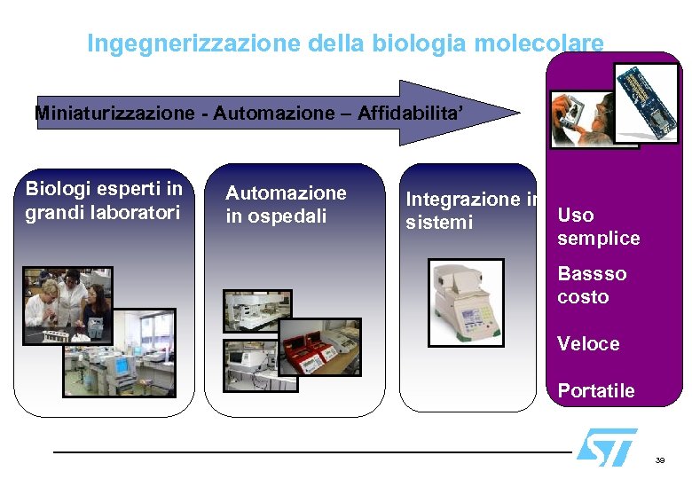 Ingegnerizzazione della biologia molecolare Miniaturizzazione - Automazione – Affidabilita’ Biologi esperti in grandi laboratori Automazione in ospedali Integrazione in Uso sistemi semplice Bassso costo Veloce Portatile 39