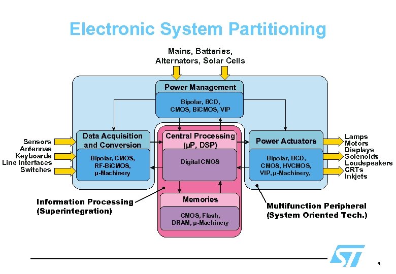 Electronic System Partitioning Mains, Batteries, Alternators, Solar Cells Power Management Bipolar, BCD, CMOS, Bi. CMOS, VIP Sensors Antennas Keyboards Line Interfaces Switches Data Acquisition and Conversion Bipolar, CMOS, RF-Bi. CMOS, µ-Machinery Information Processing (Superintegration) Central Processing (µP, DSP) Digital CMOS Memories CMOS, Flash, DRAM, µ-Machinery Power Actuators Bipolar, BCD, CMOS, HVCMOS, VIP, µ-Machinery, Lamps Motors Displays Solenoids Loudspeakers CRTs Inkjets Multifunction Peripheral (System Oriented Tech. ) 4