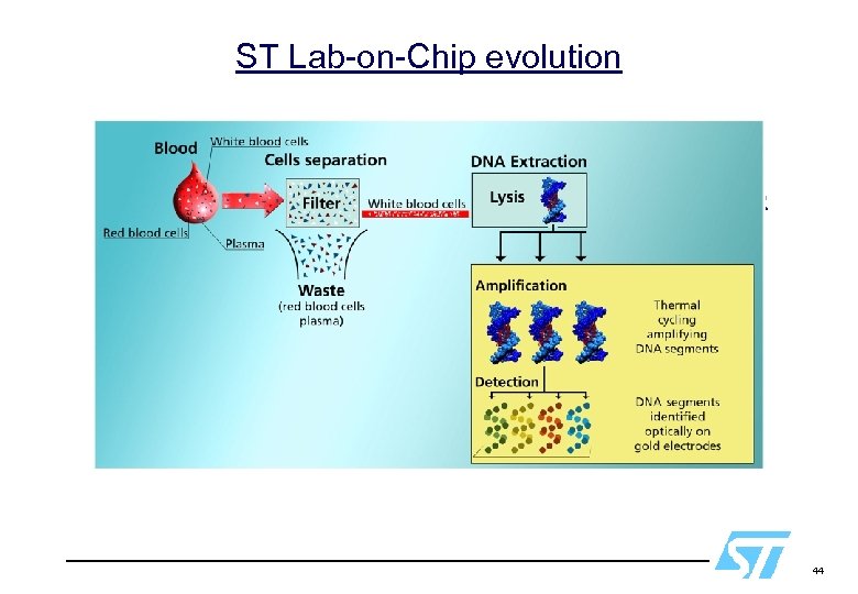 Foreseen applications DNA extraction DNA Amplification (for ex. PCR) or Medical Diagnostics - Genetic diseases - Infectious agents (virus, bacteria) - Blood typing Agroindustrial Control - GMO - species determination - microbiology - allergen detection Prognostics Environmental Control - Cancer - Polymorphisms - microbiology (air/water) 43