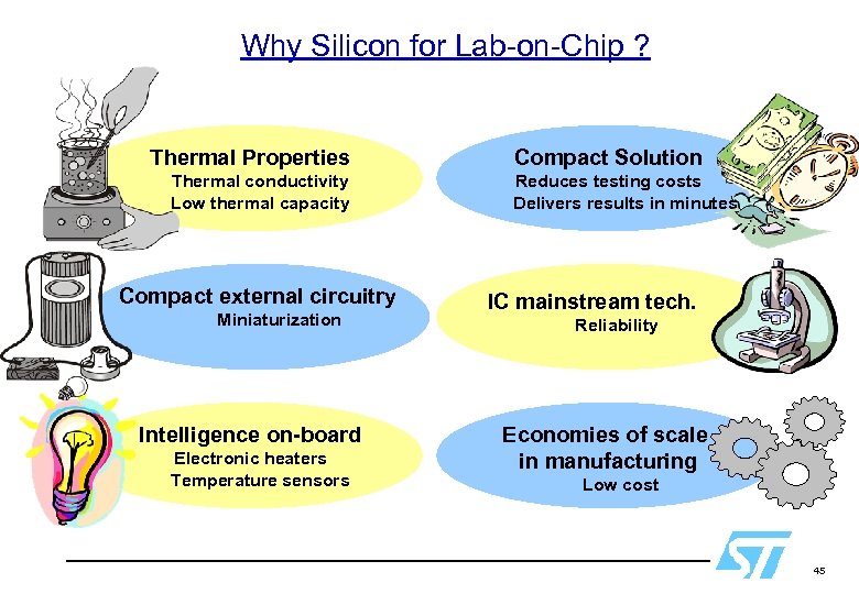 Why Silicon for Lab-on-Chip ? Thermal Properties Thermal conductivity Low thermal capacity Compact external circuitry Miniaturization Intelligence on-board Electronic heaters Temperature sensors Compact Solution Reduces testing costs Delivers results in minutes IC mainstream tech. Reliability Economies of scale in manufacturing Low cost 45
