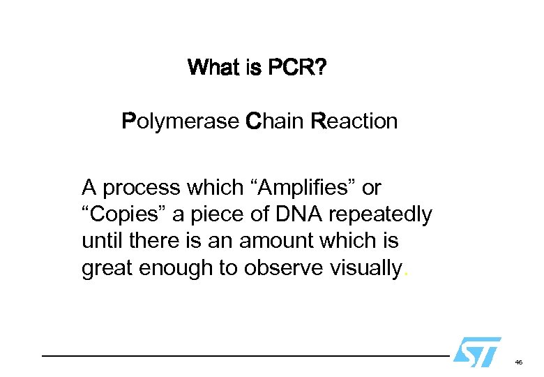 What is PCR? Polymerase Chain Reaction A process which “Amplifies” or “Copies” a piece of DNA repeatedly until there is an amount which is great enough to observe visually. 46
