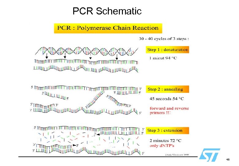Components of PCR 1. Template DNA 2. ATGC nucleoltides 3. Primers 4. Fuorescent markers 5. Taq DNA Polymerase Isolated from Thermus aquaticus, a bacterium found in a hot spring. Catalyzes the synthesis of DNA Stable at near-boiling temperatures 47
