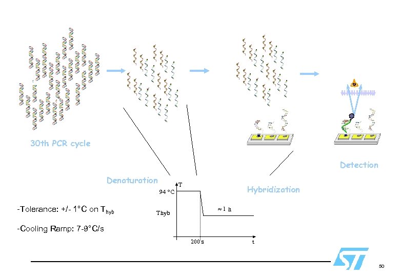 30 th PCR cycle Detection Denaturation T Hybridization 94 °C -Tolerance: +/- 1°C on Thyb » 1 h Thyb -Cooling Ramp: 7 -9°C/s 200 s t 50