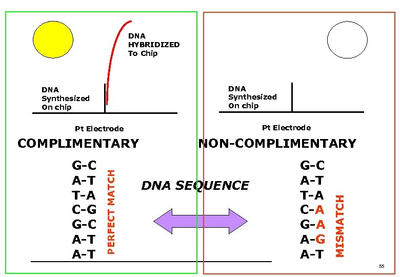 DNA HYBRIDIZED To Chip DNA Synthesized On chip Pt Electrode G-C A-T T-A C-G G-C A-T PERFECT MATCH COMPLIMENTARY NON-COMPLIMENTARY DNA SEQUENCE G-C A-T T-A C-A G-A A-G A-T MISMATCH DNA Synthesized On chip 55