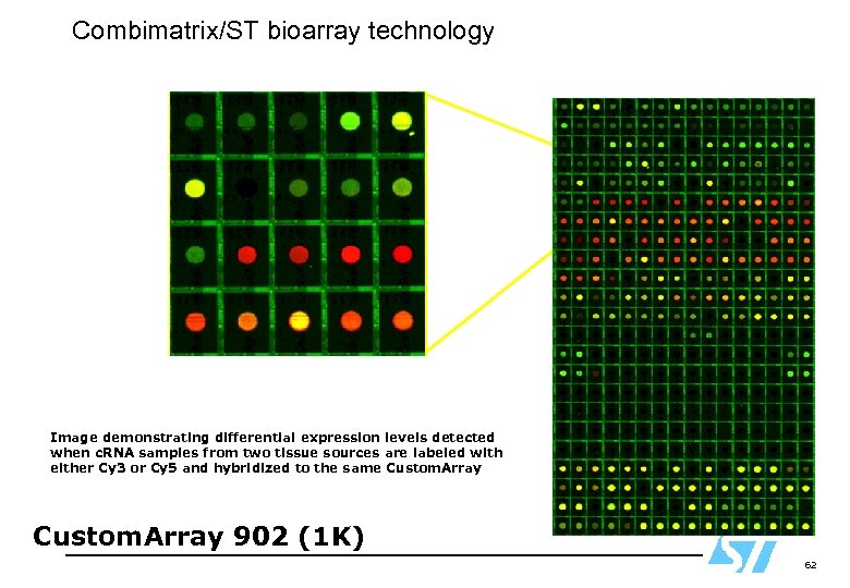 Combimatrix/ST bioarray technology Image demonstrating differential expression levels detected when c. RNA samples from two tissue sources are labeled with either Cy 3 or Cy 5 and hybridized to the same Custom. Array 902 (1 K) 62
