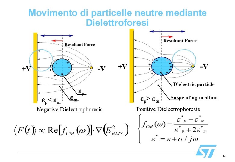 Movimento di particelle neutre mediante Dielettroforesi +V ++ + + p< m - + -+ + - -V - m p Negative Dielectrophoresis +V + + - + + + - - -V Dielectric particle p> m Suspending medium Positive Dielectrophoresis 63