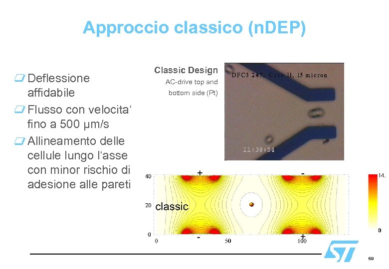 n. DEP in confronto con p. DEP dal punto di vista della progettazione microfluidica n. DEP 1. Progetto piu’ complesso 2. Separazione cellulare e focalizzazione simultanee 3. Maggior flessibilita’ in caso di lisi elettrica o chimica 4. IP in possesso di EVOTEC p. DEP Progetto semplice (planare) Per focalizzare le cellule necessita un passo di n. DEP Per la lisi chimica occorre un ulteriore elemento focalizzatore OK per lisi elettrica IP non tutta in EVOTEC Maggior rischio di occlusione 68